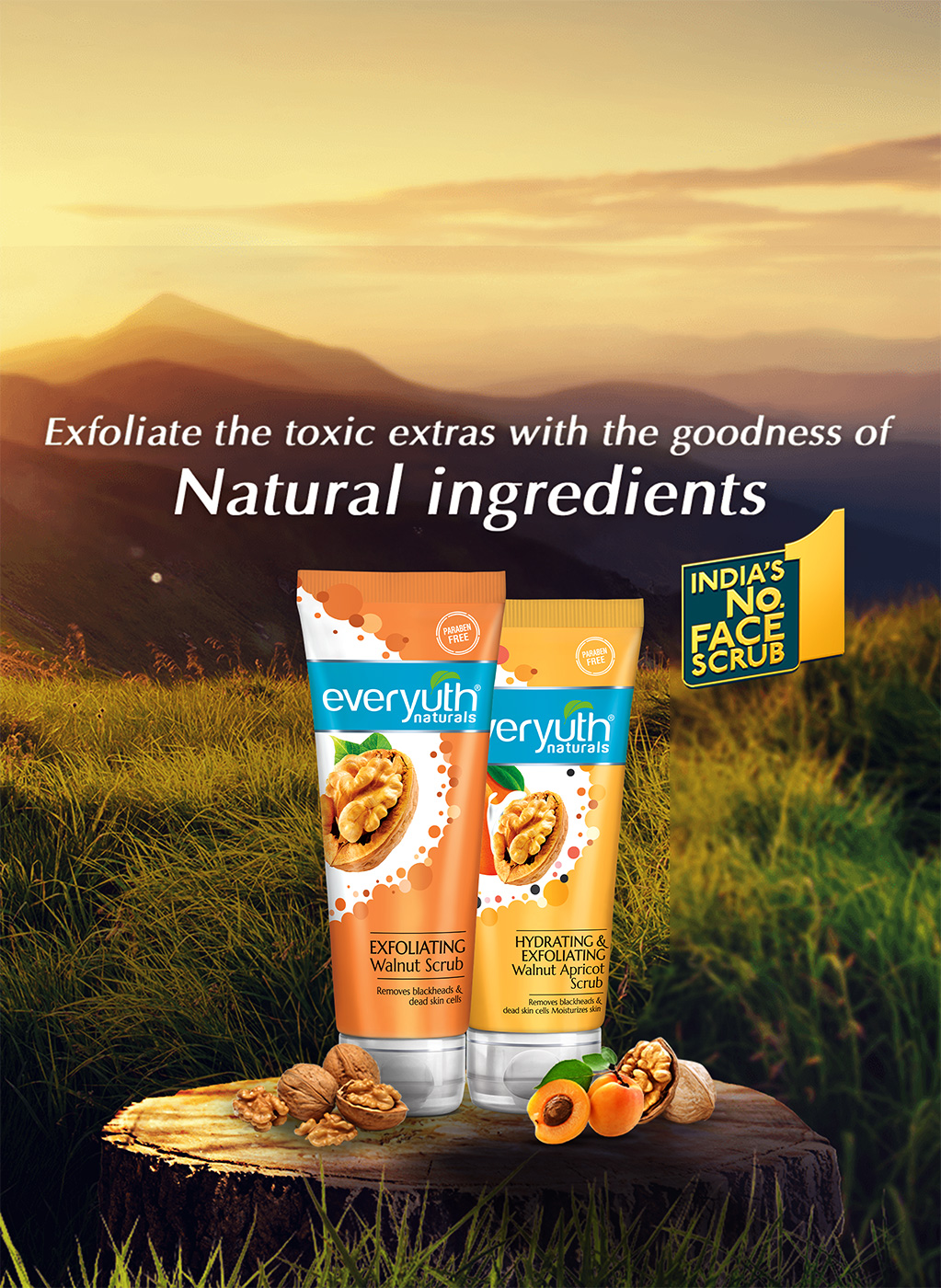 To purify your skin, an occasional cleanse with a face wash is not sufficient. You need natural exfoliator like walnut face scrub to unclog pores, eliminate dirt, dead skin, sebum and excess oils that are caused by sun damage, dust and pollution. It evens out skin tone, moisturizes, and brings dull and dry skin back to life, without being too abrasive. Everyuth Naturals Walnut Scrub is the best face scrub in India that gives your skin the ultimate care and keeps it feeling thoroughly cleansed, hydrated, radiant, and smooth. The Everyuth Scrub for blackhead removal combats not only blackheads but whiteheads and dirt too! For oily skin, dry skin and normal skin, Everyuth's vitamin-enriched scrub is the best choice and India's No 1 Face scrub based on all India urban sales volume, surveyed by 'Kantar World Report'. YTD Dec 2023
